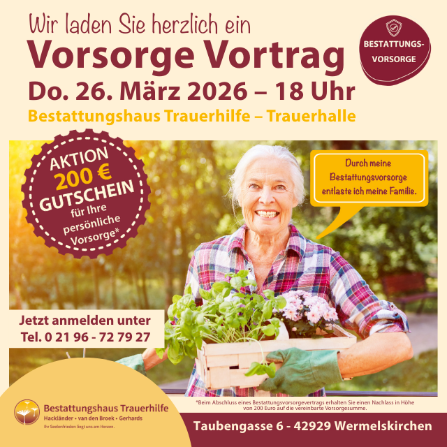 Wermelskirchen. Über den Tod zu sprechen, fällt vielen Menschen schwer – doch rechtzeitige Vorsorge kann Angehörigen im Ernstfall eine große Last abnehmen. Am Donnerstag, 26. März 2026, um 18 Uhr lädt das Bestattungshaus Trauerhilfe, Taubengasse 6, zu dem kostenlosen Vortrag „Bestattungsvorsorge – eine Sorge weniger“ ein.